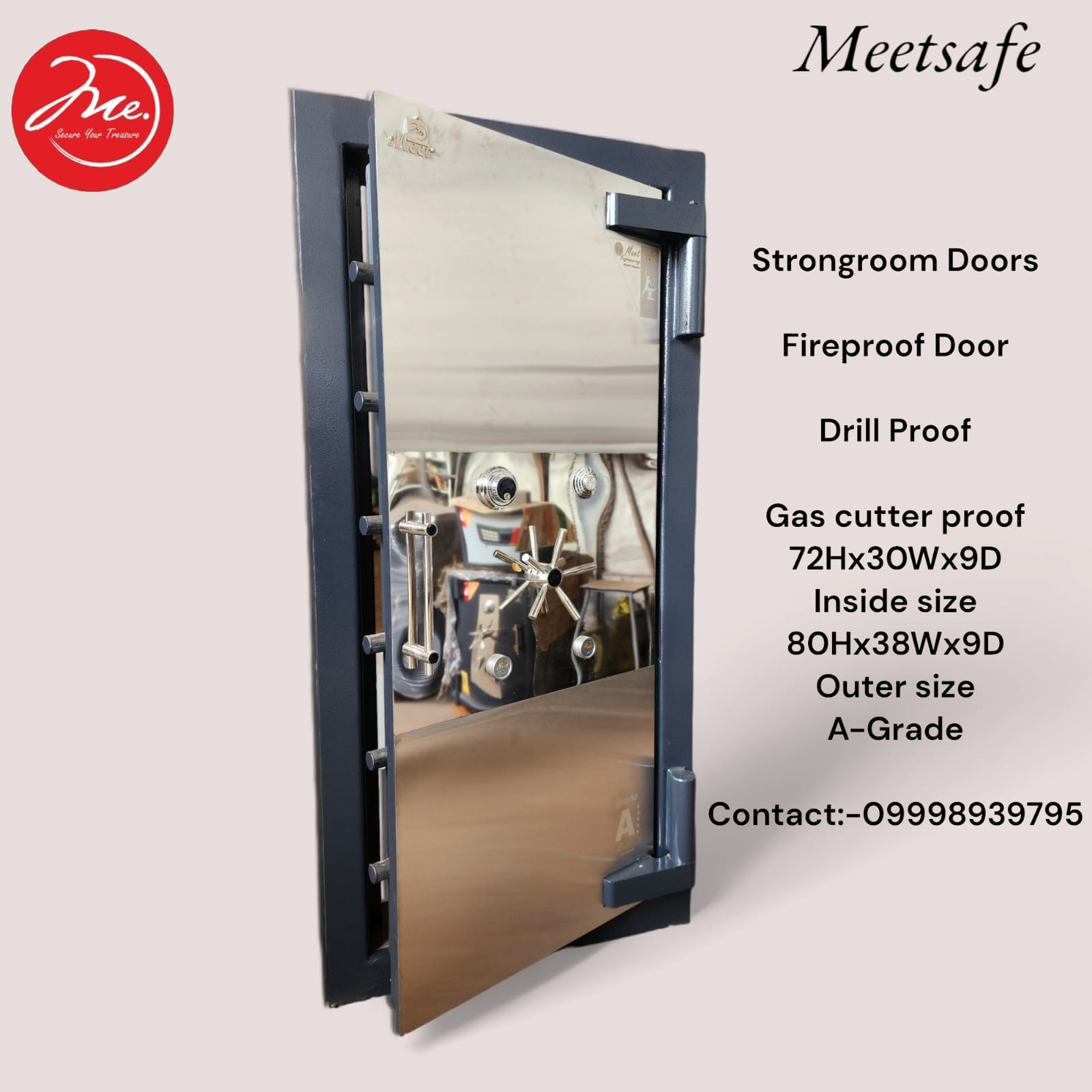 STRONG ROOM DOOR (72” x 30” x 9”, 700 KG) BY MEET ENGINEERING Meet Engineering offers a high-security Strong Room Door designed to protect valuable assets in banks, financial institutions, jewellery showrooms, government offices, and high-risk commercial facilities. Built with heavy-duty construction and advanced locking mechanisms, this door ensures maximum resistance against burglary, fire, and forced entry. Manufactured with a robust steel structure, the strong room door has overall dimensions of 72 inches (height) x 30 inches (width) x 9 inches (thickness) and a solid weight of approximately 700 kg, providing unmatched strength and durability. The door is reinforced with multiple layers of hardened steel and anti-cut plates to withstand drilling, torching, and impact attacks. The door is equipped with a high-precision multi-bolt locking system, smoothly operated through a secure handle mechanism. It supports dual locking options, including a key lock, mechanical combination lock, or digital lock, as per customer requirement. Heavy-duty hinges and a precisely engineered frame ensure smooth operation while maintaining airtight and tamper-proof sealing. Finished with an anti-corrosive powder-coated or enamel paint, the strong room door offers long service life with minimal maintenance. Each unit is designed and tested as per industry security standards, making it a reliable choice for critical security applications. Key Features: Size: 72” x 30” x 9” Weight: Approx. 700 kg Heavy-duty steel construction Multi-bolt high-security locking system Optional mechanical/digital lock configurations Anti-drill and anti-cut protection Smooth operation with robust hinges Long-lasting, corrosion-resistant finish Meet Engineering delivers customized strong room doors with assured quality, precision engineering, and uncompromising security.